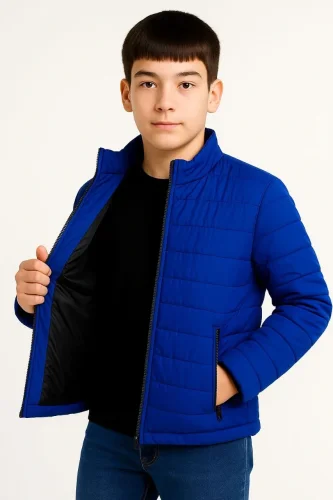 Erkek Çocuk Şişme Mont Hafif ve Sıcak Tutucu Kışlık Fermuarlı Su İtici Rahat Günlük Mont Kapüşonuz Modern Tasarım Saks Mavisi