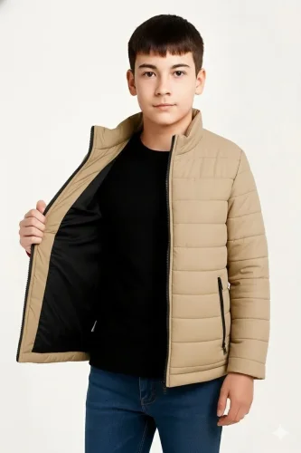 Erkek Çocuk Şişme Mont Hafif ve Sıcak Tutucu Kışlık Fermuarlı Su İtici Rahat Günlük Mont Kapüşonuz Modern Tasarım Bej