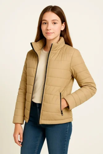 Kız Çocuk Şişme Mont Hafif ve Sıcak Tutucu Kışlık Fermuarlı Su İtici Rahat Günlük Mont Kapüşonuz Modern Tasarım Bej