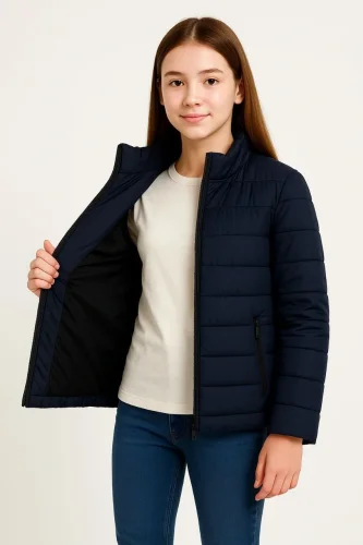 Kız Çocuk Şişme Mont Hafif ve Sıcak Tutucu Kışlık Fermuarlı Su İtici Rahat Günlük Mont Kapüşonuz Modern Tasarım Lacivert