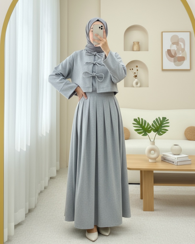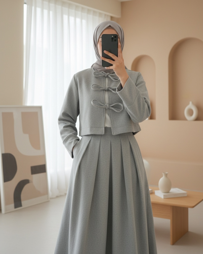 • Önü Bağcıklı Etekli Kaşe Takım Gri