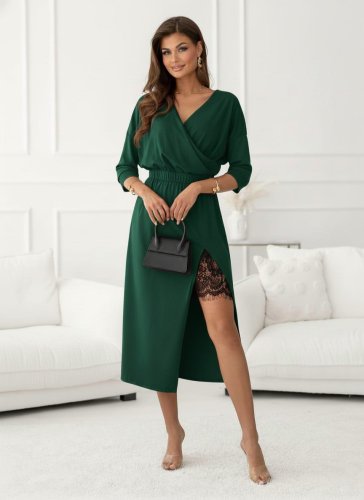• Kadın uzun kollu kruvaze yakalı yandan dantelli midi ithal krep elbise