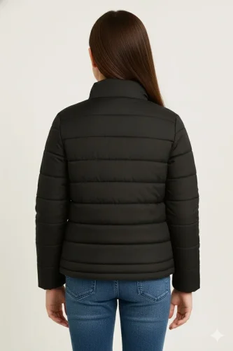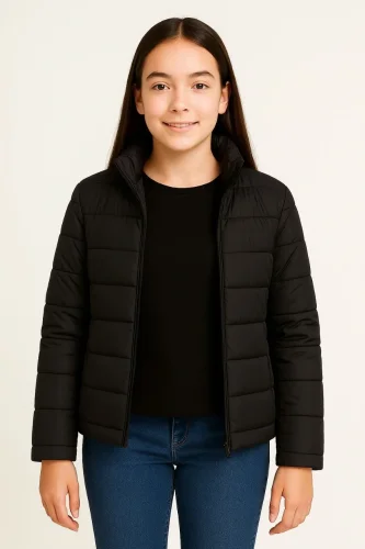 • Kız Çocuk Şişme Mont Hafif ve Sıcak Tutucu Kışlık Fermuarlı Su İtici Rahat Günlük Mont Kapüşonuz Modern Tasarım Siyah
