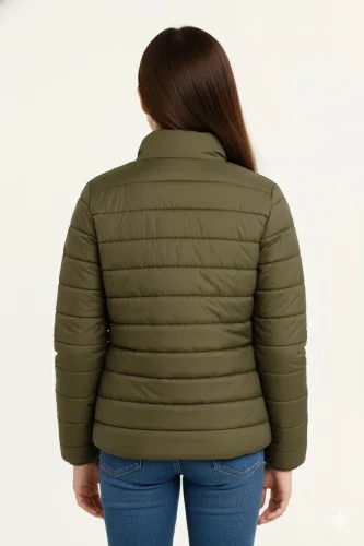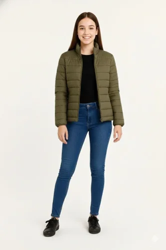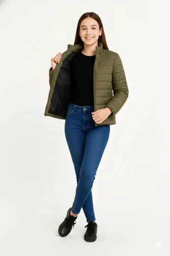 • Kız Çocuk Şişme Mont Hafif ve Sıcak Tutucu Kışlık Fermuarlı Su İtici Rahat Günlük Mont Kapüşonuz Modern Tasarım Haki
