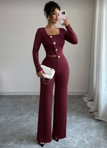 Kadın uzun kol kare yaka asimetrik düğme detay bluz ve yüksek bel pantolon ikili takım