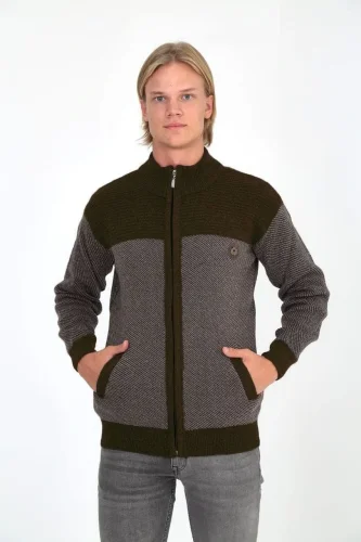 • Erkek Fermuarlı Triko Hırka Yüksek Yaka Cepli Günlük Şık Rahat Kalıp Triko Kahverengi