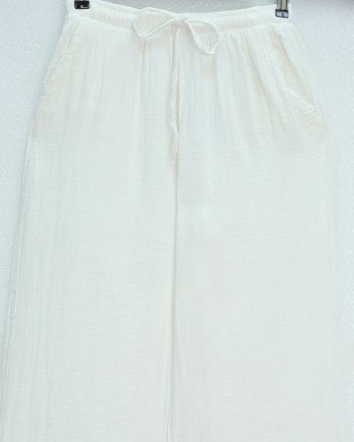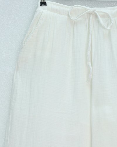 • Beli Lastikli Bağcıklı Bol Paça Müslin Pantolon Ekru